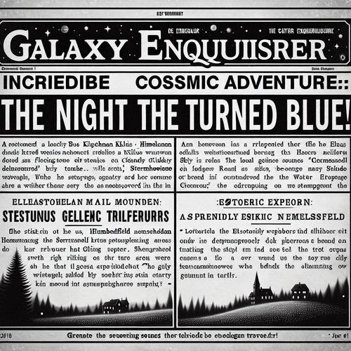 In den frühen Morgenstunden des gestrigen Tages wurde die beschauliche Kleinstadt Sternenhausen zum Zentrum eines wahrhaft galaktischen Schauspiels! Unter einem plötzlich blau erleuchteten Himmel schworen Hunderte von Augenzeugen, sie hätten sich mitten in einem außerirdischen Drama wiedergefunden. Die geheimnisvolle Lichtexplosion hinterließ die Bewohner in einem Zustand ungläubigen Staunens und sacht zitternd vor Aufregung!